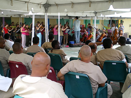 Iedereen van het orkest (maar vooral de dames) moest zich zo 'niet sexy' mogelijk kleden. Lange broeken/rokken, grote t-shirts en dichte schoenen dus. Wat hadden we het warm! We waren best zenuwachtig aan het begin maar de Ricciotti-magie werkte zelfs hier. Voor we het wisten was het ook hier erg gezellig en deden ook de stoere 'inmates' mee. Ze genoten van de klassieke klanken, lachten zich een ongeluk bij de 'gastdirigent' en schreeuwden om een toegift.