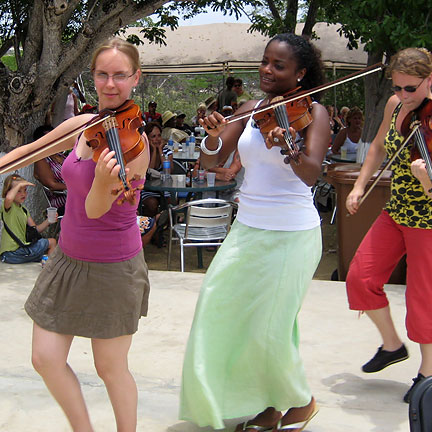 Als je wekenlang omringd wordt door de zoete klanken van violen wil je dat ook wel eens een keer leren. Ik had dus mijn eerste 3 noten geleerd en wilde al gelijk meedoen met het 'loopstuk'. Tot mijn grote schrik kreeg ik de volgende dag een mailtje van iemand die 'geluidsopnames' van mijn optreden had. Brrr, als die maar niet op Youtube terecht komen. Maar wees eens eerlijk... het ziet er wel cool uit!